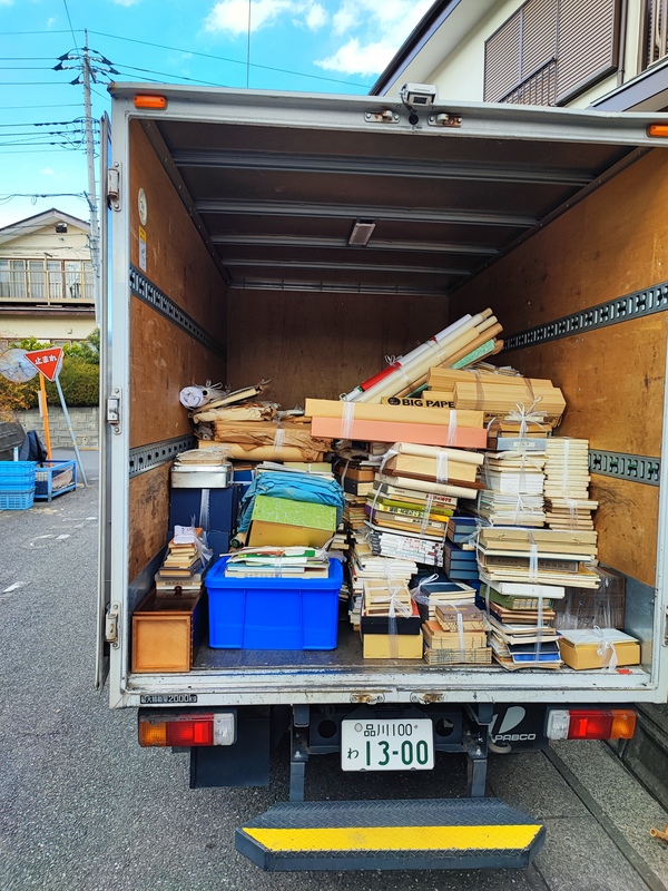段ボール・木箱に収められたこれらの品々を、2トントラック1台分に満載し、丁寧に運び出しました。