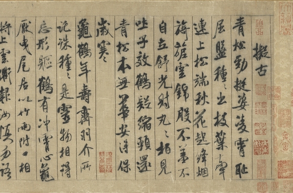 米芾(1052-1108)、字は元章、湖北襄陽の人(現在の湖北省襄陽市)、蔡襄と蘇軾、黄庭堅とともに北宋四大書家とされる。「蜀素帖」は米芾が応林希(1068-1100に活動)の求めに応じて、貴重な蜀素(絹布)に八首の詩を書いた作品である。布地に織り込まれた烏絲欄の枠線内に書かれてはいるが、舞い飛ぶように伸びやかな筆遣いは実に生き生きとして、形式に捉われている箇所は微塵もない。董其昌はこの作品を「全力で象を捉える獅子のようだ」と絶賛している。