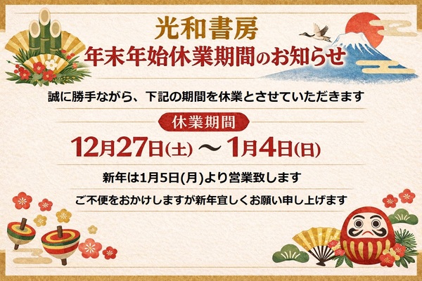 ※12月26日(金)15時以降にいただいたご注文及びメールへの返信は、1月5日(月)より順次行います。